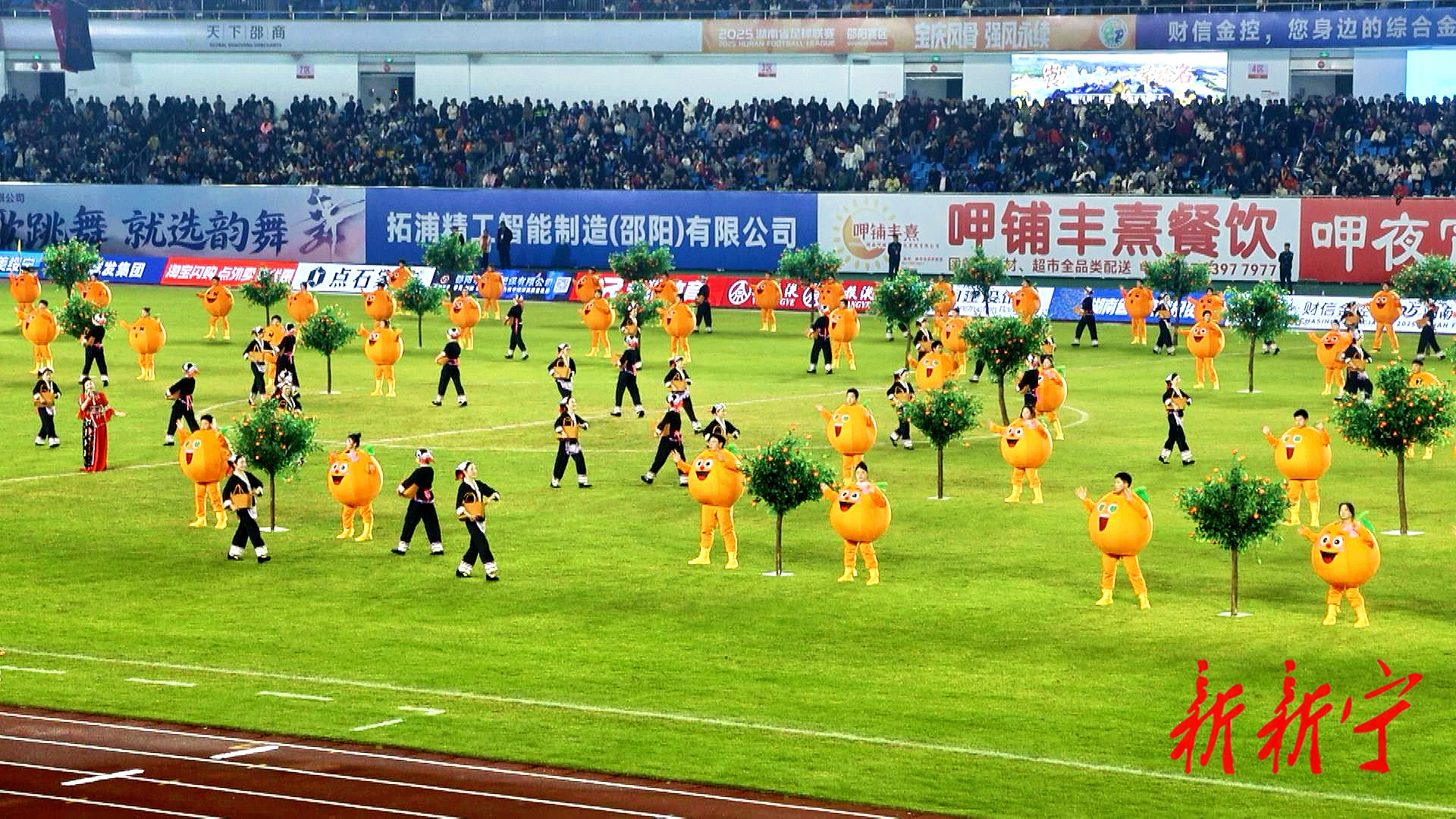 比賽中場(chǎng)休息時(shí)段,新寧精心籌備的主題演出精彩上演。以崀山臍橙為核心的團(tuán)體歌舞活力登場(chǎng),演員們或身著創(chuàng)意橙子外殼服飾,或身著特色民族服飾,用靈動(dòng)舞姿復(fù)刻橙子園豐收盛景,鮮活傳遞豐收喜悅,贏得現(xiàn)場(chǎng)觀眾陣陣掌聲。與此同時(shí),融合崀山自然風(fēng)光、臍橙特色產(chǎn)業(yè)與新寧非物質(zhì)文化遺產(chǎn)或非遺的主題花車在場(chǎng)內(nèi)巡游,車上身著民族服飾的演員主動(dòng)與觀眾互動(dòng),讓新寧特色文化近距離觸達(dá)大眾。